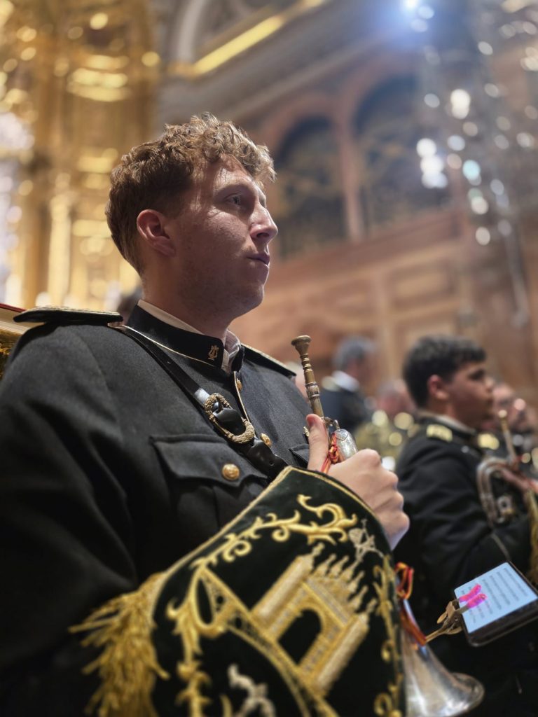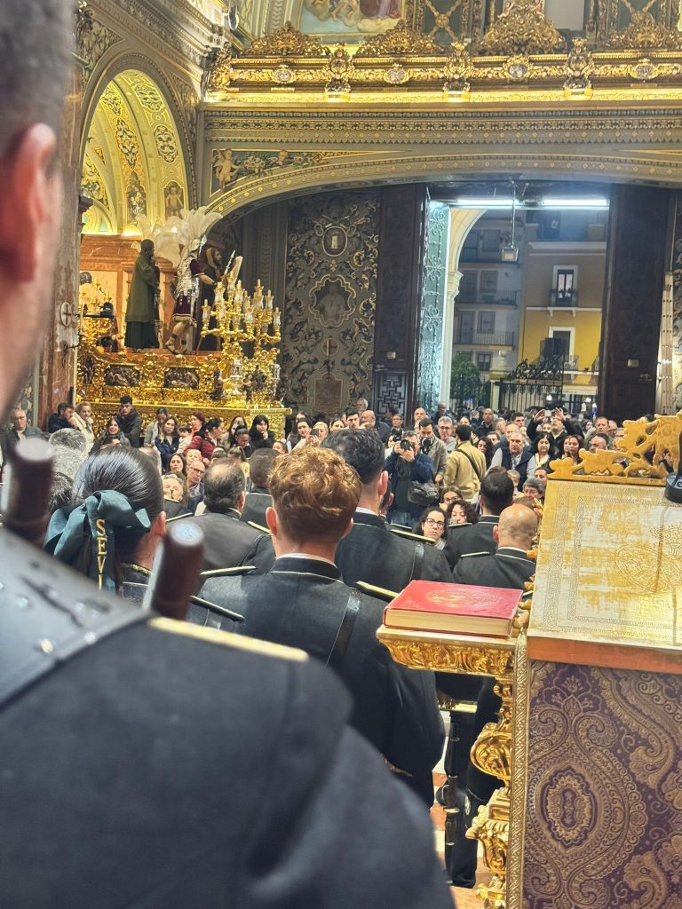 Partimos desde debajo del mismísimo Arco de la Macarena —monumento que llevamos con orgullo en nuestro propio escudo, junto al puente de Triana— a paso lento. Tras dos compases de tambor, la corneta marcó La Sentencia de Cristo, de Manuel Pérez Tejera. Avanzamos hasta la puerta de la Basílica, deteniéndonos en el dintel, donde la marcha encontró su culminación antes de que la formación accediera al interior y tomara su disposición.