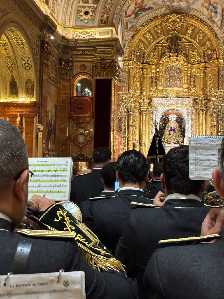La Basílica presentaba un lleno absoluto. Justo a sus pies, con la Virgen de la Esperanza a nuestra espalda, amparándonos desde su camarín, la banda se situaba en una estampa de enorme simbolismo. Para muchos de nuestros integrantes, hermanos de la Hermandad de la Macarena, aquel momento iba más allá de lo interpretativo. Las medallas al cuello, las miradas y los gestos evidenciaban la emoción contenida de quienes sabían lo que significaba estar allí.