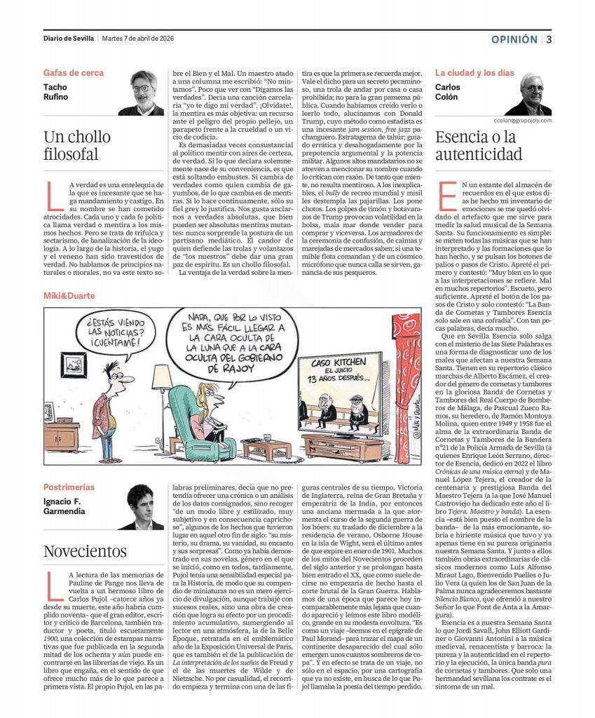 Amanece este día con un magnífico artículo en el periódico el Diario de Sevilla, y no queríamos dejar pasar la ocasión sin hacernos eco del mismo. El mismo está escrito por Carlos Colón y se puede encontrar en el siguiente enlace.
