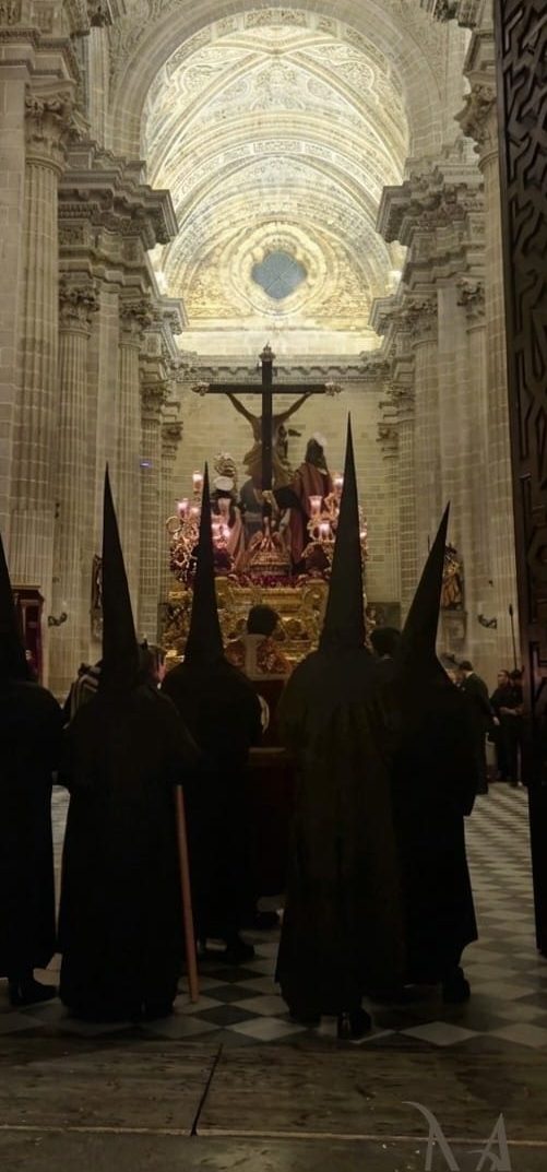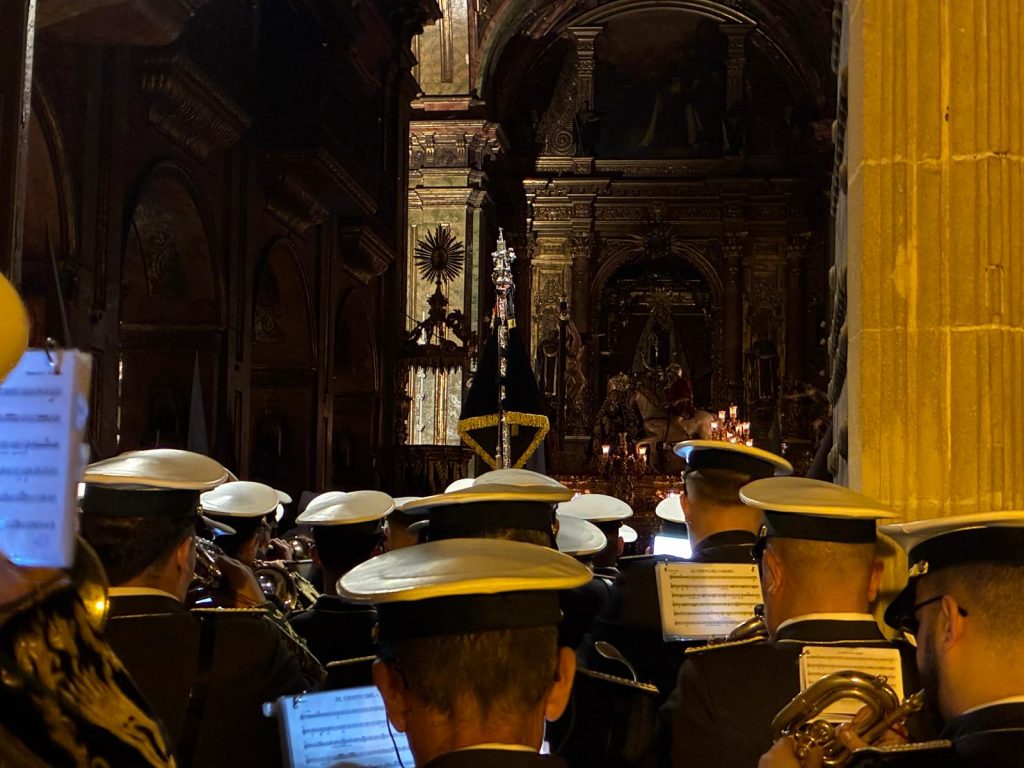 A las 19:25 horas, la Cruz de Guía cruzaba el dintel basilical al son de Santa Cruz, abriendo paso a un cortejo sobrio y medido, donde cada nazareno parecía custodiar el silencio como parte de su propia penitencia.