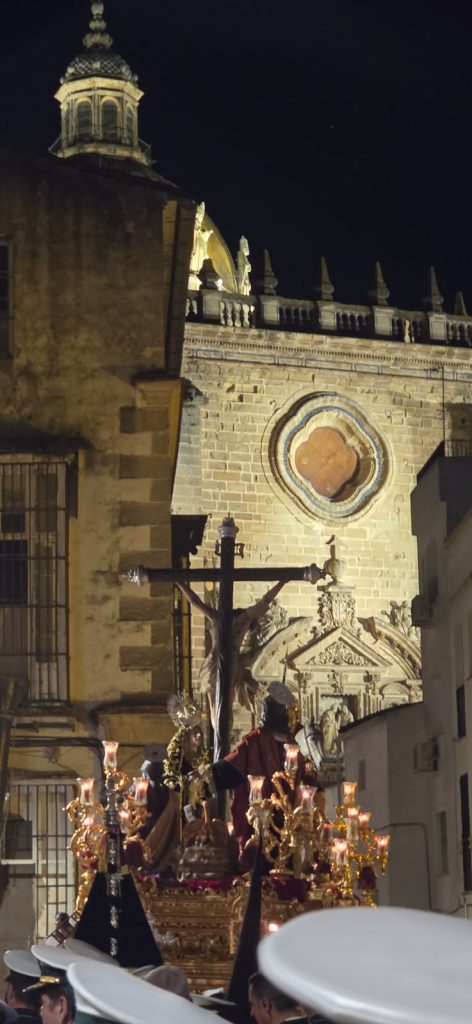 Tras la entrada en la Santa Iglesia Catedral, la cofradía continuó su caminar en un ambiente de recogimiento. La noche envolvió el recorrido con una atmósfera más íntima, donde la música acompañó cada paso con serenidad.
