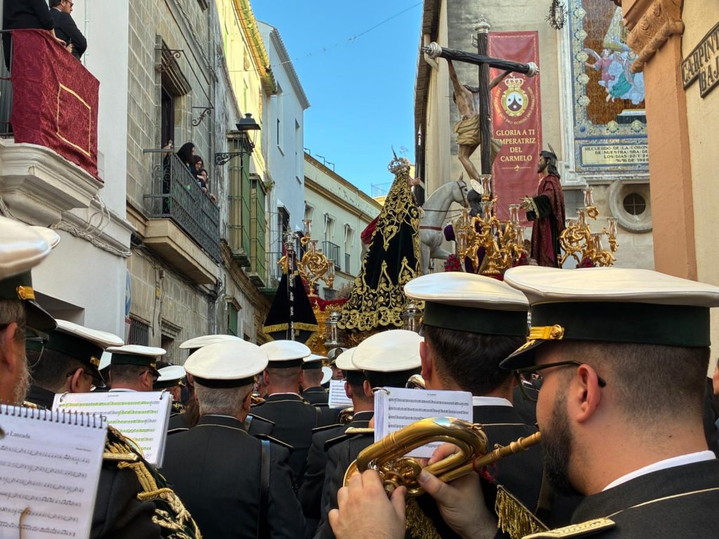 La tarde no cayó en Jerez: se recogió lentamente sobre los muros de la Basílica del Carmen, como si supiera que lo que estaba a punto de comenzar exigía silencio. Hubo un instante —breve, casi imperceptible— en el que la ciudad dejó de avanzar para escucharse a sí misma. Y en ese latido contenido, la Hermandad de la Sagrada Lanzada volvió a ponerse en la calle.